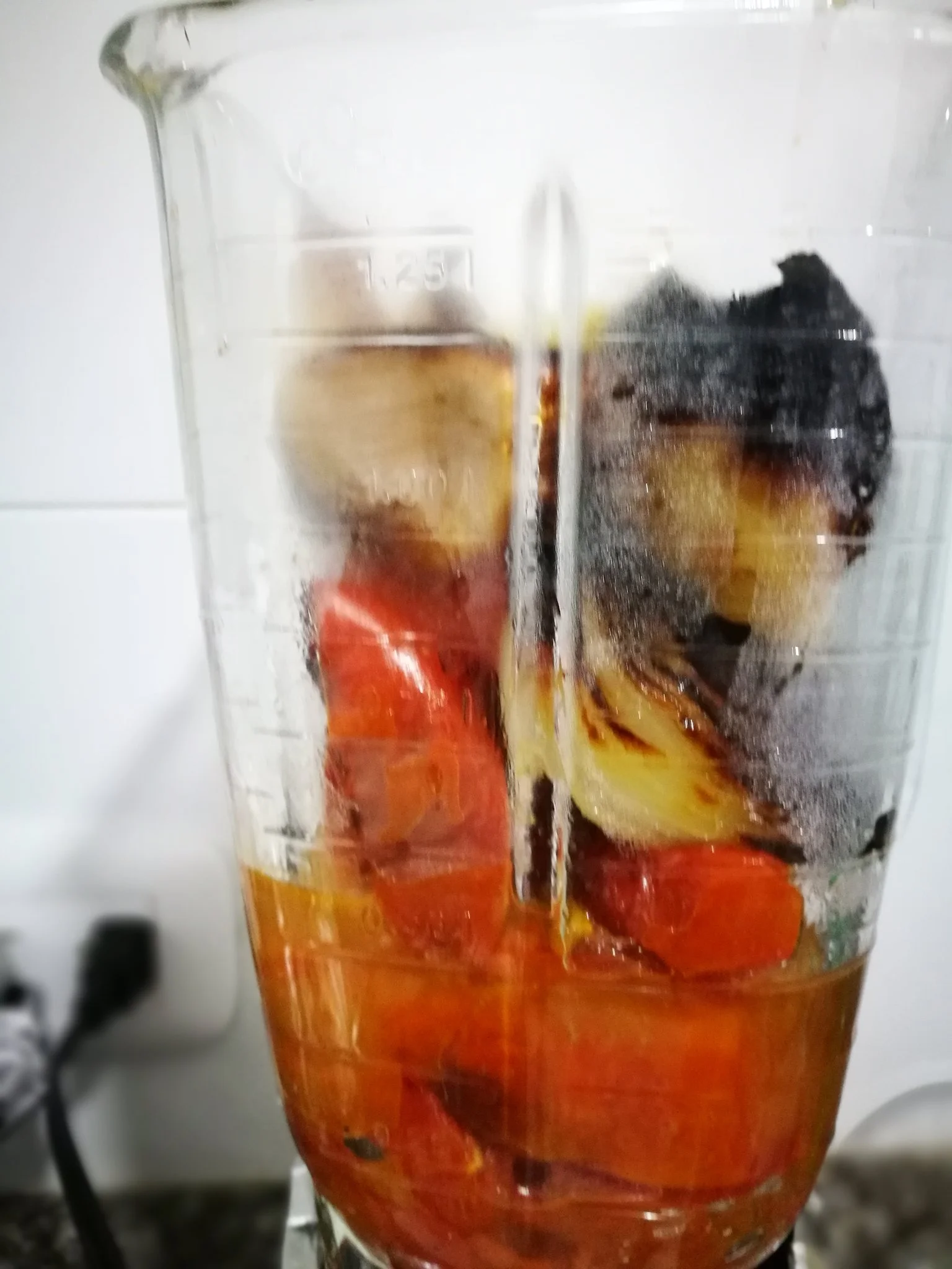 Ahora licúo tomates, cebollas y ajos rostizados.