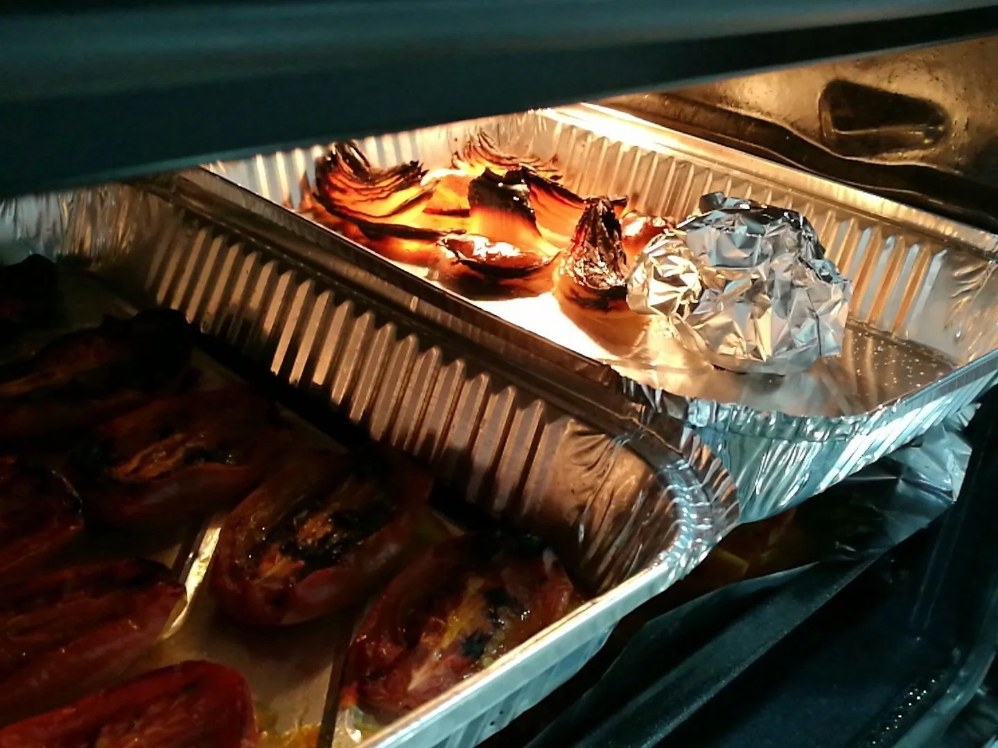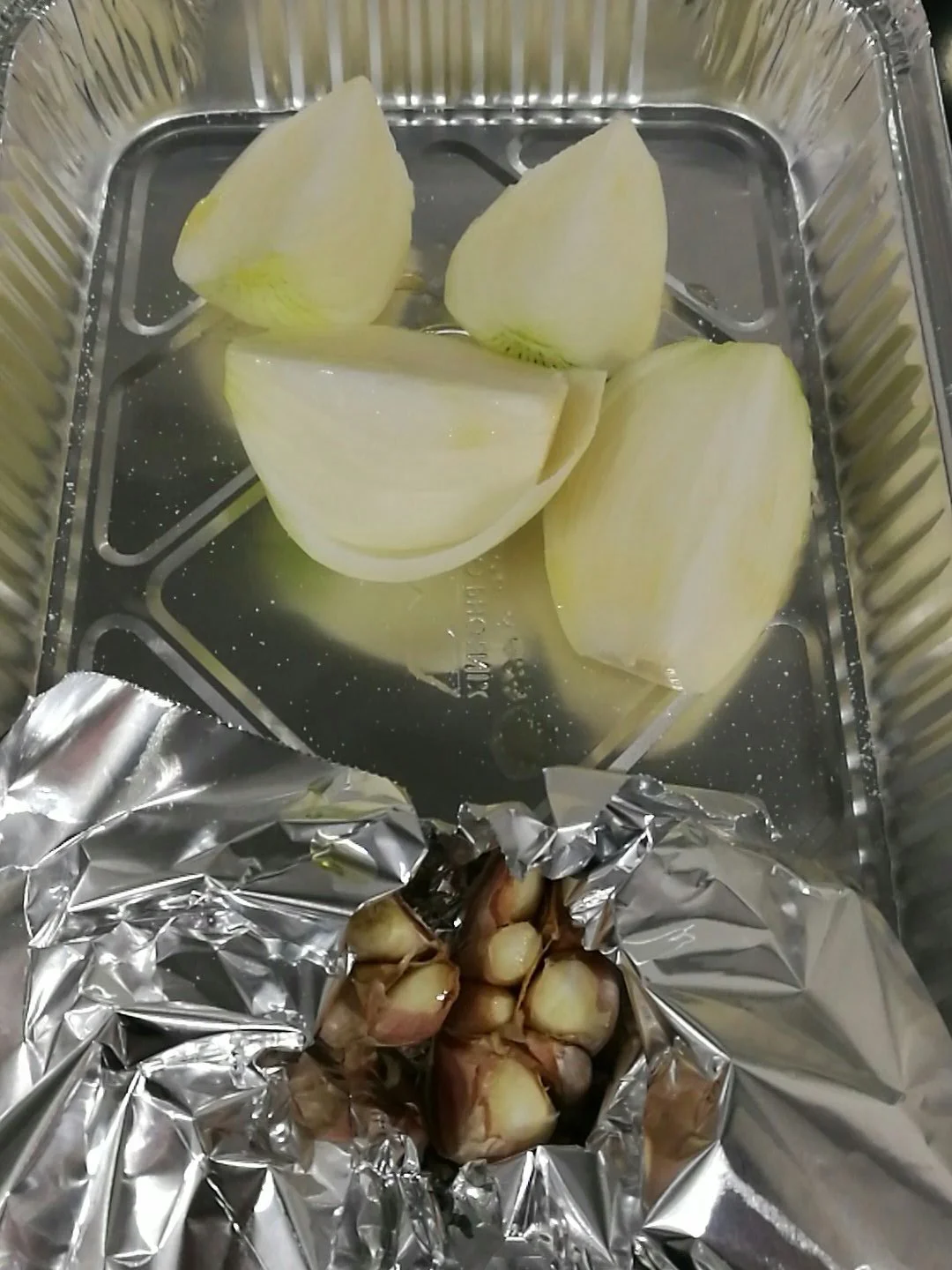 Hago lo mismo con una cebolla y una cabeza de ajos -esta última envuelta en aluminio-. Un poco de oliva y sal por encima de todo, y al horno que ya está CALIENTE.