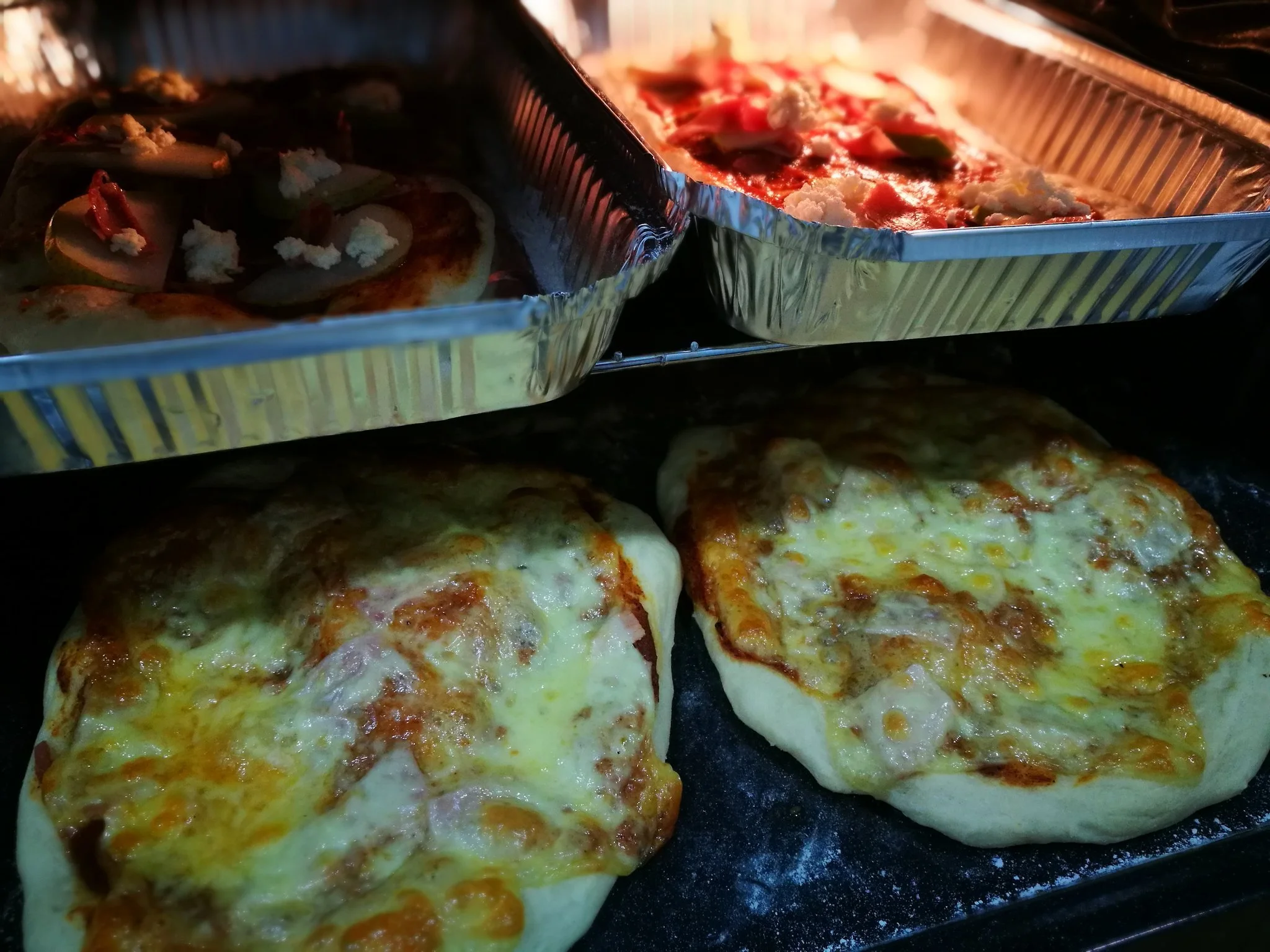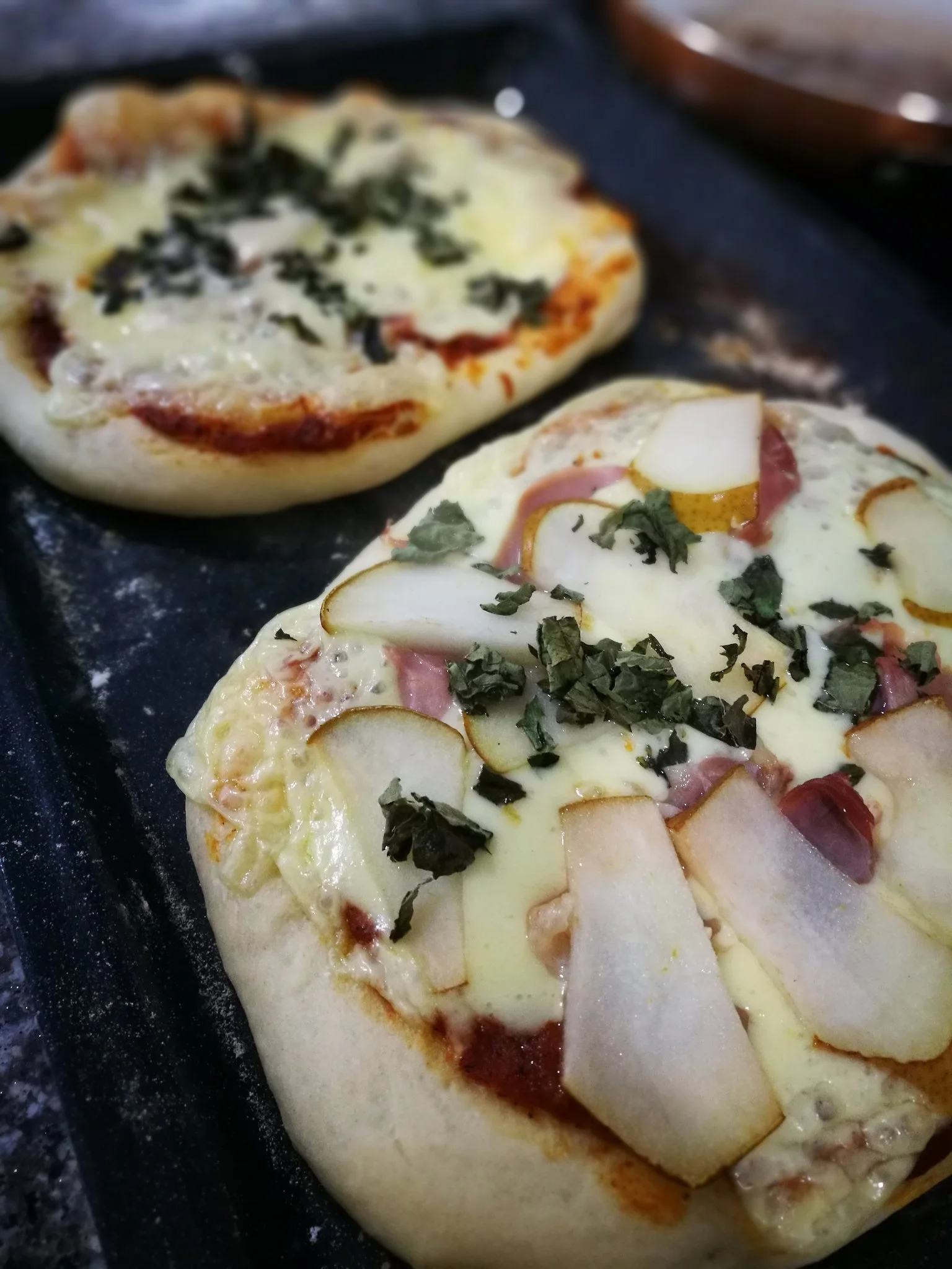 Hola, comensales. Así se veía la primer tanda de pizzas. Abajo jamón y mozzarella, arriba serrano y pera. Ñom.