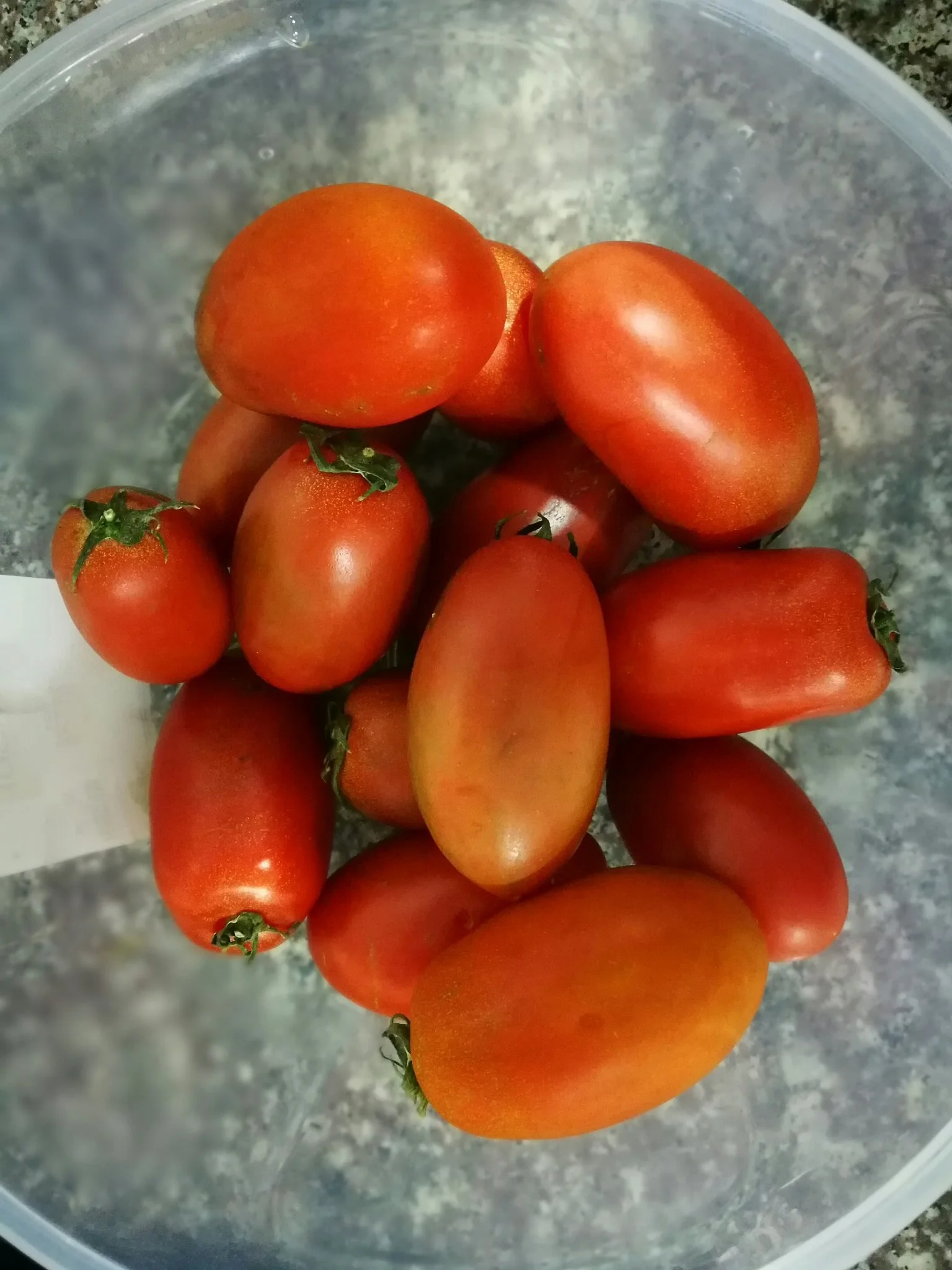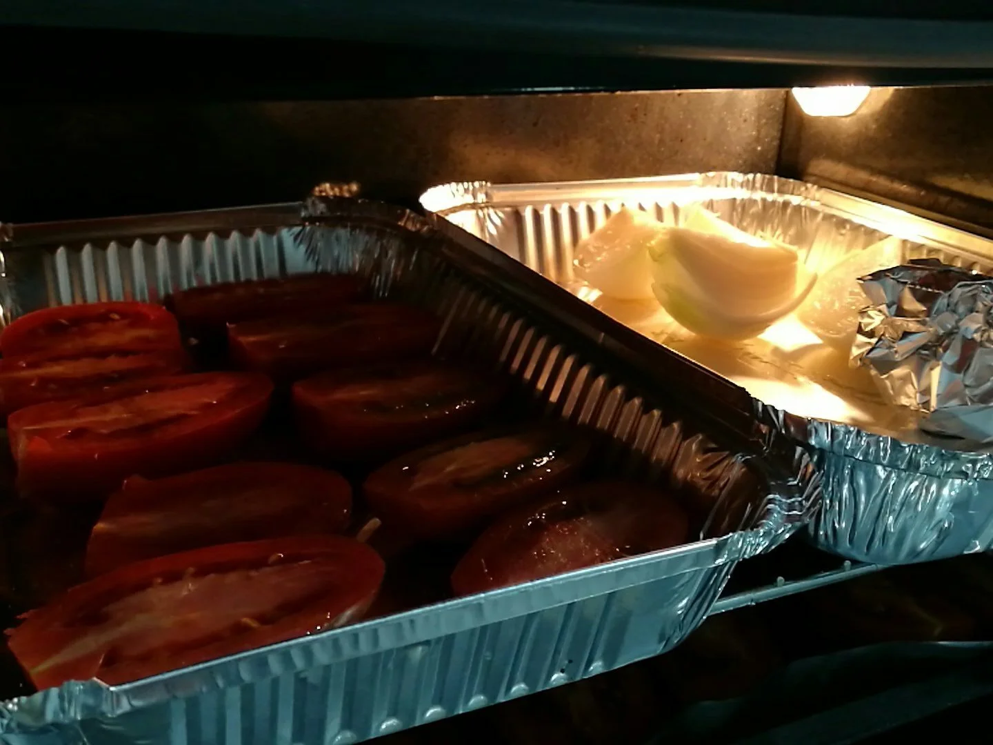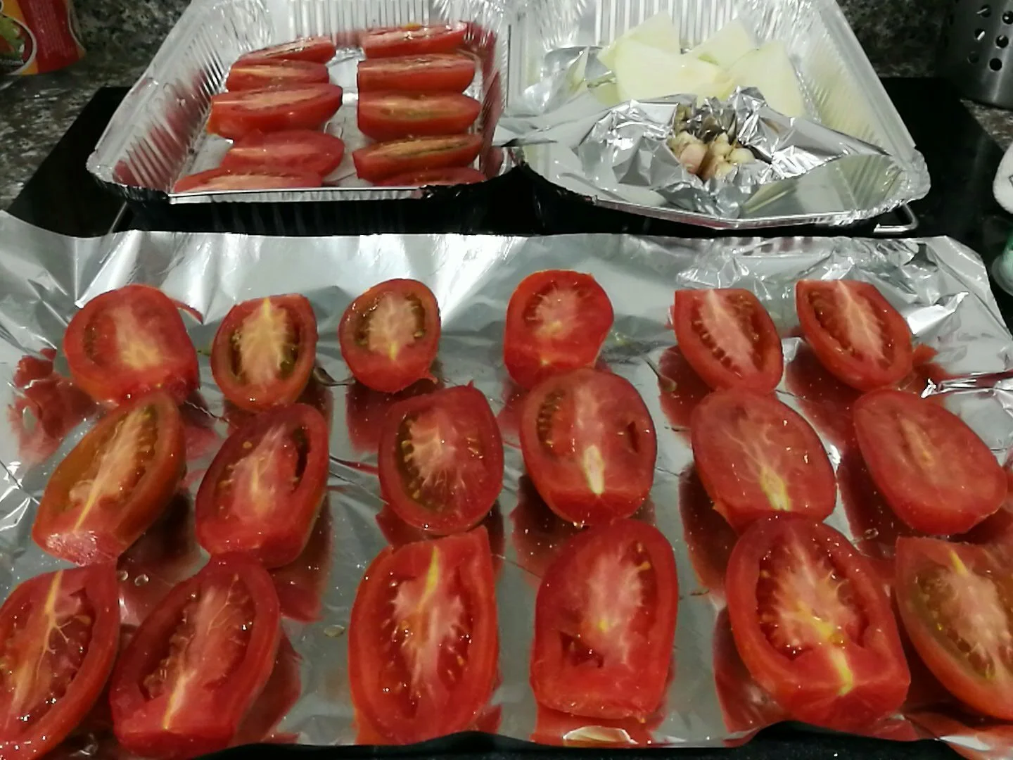 Corto muuucho jitomate marzano por la mitad. Lo acomodo en charolas horno-friendly.