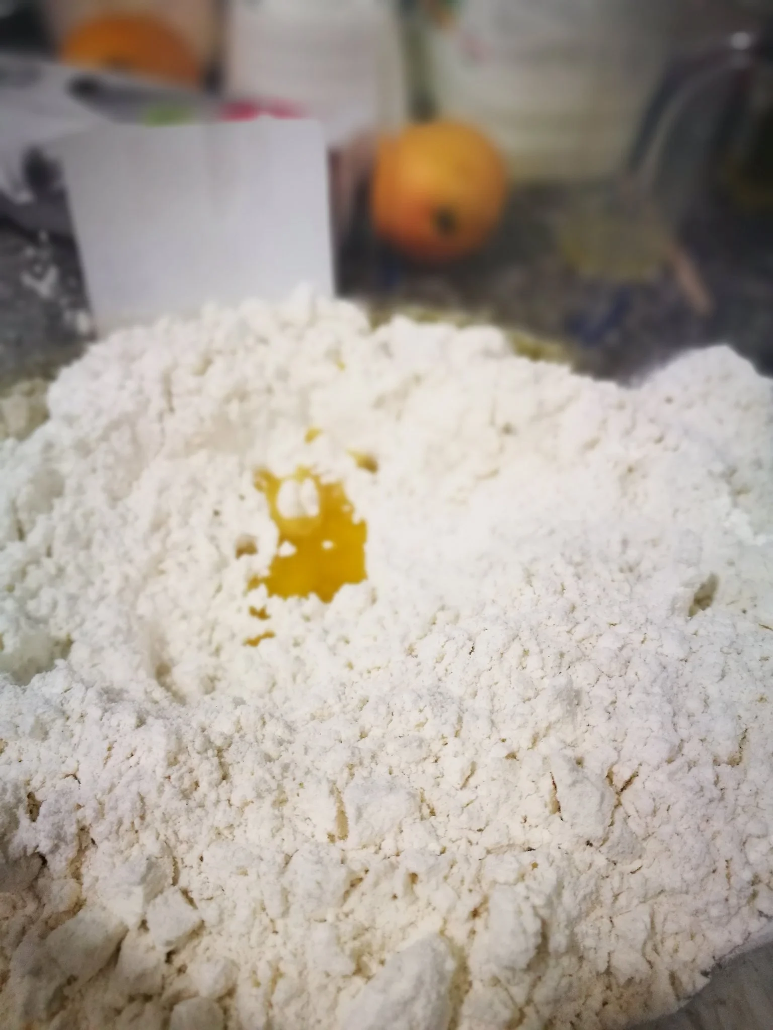 Mientras la leche se calienta, empiezo a preparar la masa de pizza. Harina, sal, oliva y agua en un bowl.